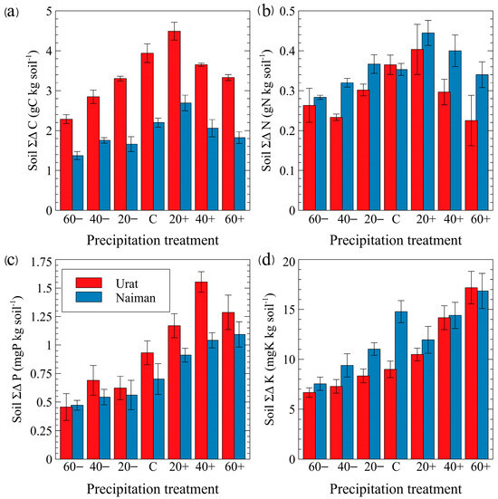 Regarding total soil nutrient buildup (ΣΔi), the interaction of site × precipitation was significant for all nutrients (Table 2); however, the underlying phenomena slightly differed depending on the nutrient in question. In the case of ΣΔC, the interaction revealed that total C buildup was higher in Urat under all precipitation treatments, but the site-specific differences were slightly lower under the −40% treatment (Figure 5). The total C buildup was not linear along the precipitation treatment gradient: the highest buildup occurred under the +20% treatment while the lowest one was observed under the −60% treatment with respect to the control (Figure 5). For the total N buildup, the site × precipitation interaction indicated that the higher buildup in Naiman was particularly marked at the top of the high precipitation gradient (−40% and −60%) but not under the other precipitation treatments (Figure 5). The precipitation’s effect was more erratic than that of total C buildup but, as with C, the highest total N buildup occurred at +20% (Figure 5). For the total P buildup, between-site differences (higher in Urat) were more marked at the high end of the gradient as well (significant site × precipitation interaction; Figure 5). For Naiman, there was a linear increase in the total P buildup along the precipitation gradient; however, for Urat, the maximum occurred at +40%, while the minimum occurred at −60% (Figure 5). Finally, for total K buildup, the significant site × precipitation interaction indicated that the between-site differences (higher buildup in Naiman) were more marked toward the low end of the precipitation gradient (Figure 5). There was a linear increase in the total K buildup along the precipitation gradient (in Naiman, the amount in the control was higher than in the +20% and +40% treatments; Figure 5).