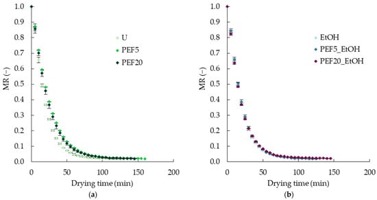 Drying kinetics of yellow mealworm larvae: (a) untreated (U) and pretreated with PEF (PEF5 and PEF20—pulsed electric field with specific energy consumption of 5 and 20 kJ/kg, respectively), and (b) combined pretreatment with ethanol (EtOH) followed by PEF.