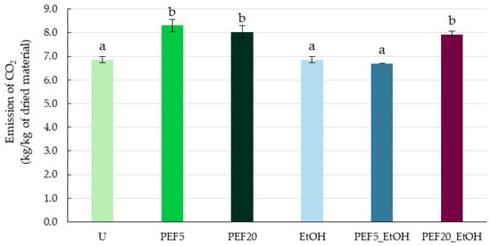 The emission of CO2 during the drying of yellow mealworm larvae: without pretreatment (U), pretreated with PEF (PEF5 and PEF20—pulsed electric field with specific energy consumption of 5 and 20 kJ/kg, respectively), and combined pretreatment with ethanol (EtOH) followed by PEF, a,b; the same letters above columns denote no significant differences between mean values (Tukey’s HSD, p < 0.05).