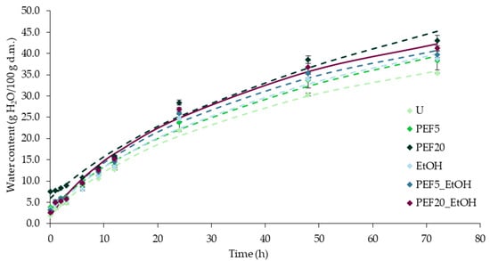 The hygroscopic kinetics of dried yellow mealworm larvae: without pretreatment (U), pretreated with PEF (PEF5 and PEF20—pulsed electric field with specific energy consumption of 5 and 20 kJ/kg, respectively), and combined pretreatment with ethanol (EtOH) followed by PEF. Dotted lines represent values obtained from mathematical modeling.