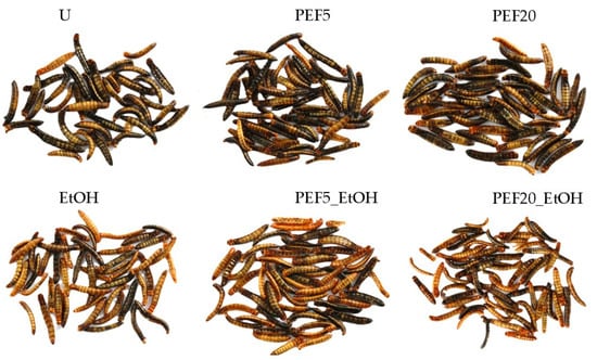 Photos of dried yellow mealworm larvae: without pretreatment (U), pretreated with PEF (PEF5 and PEF20—pulsed electric field with specific energy consumption of 5 and 20 kJ/kg, respectively), and treated with combined pretreatment of ethanol (EtOH) followed by PEF.