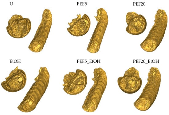 The pretreatment and drying process may cause various structural changes in the material. Considering images obtained via X-ray microtomography (Figure 5), the impact of PEF on the internal structure of dried yellow mealworm larvae can be seen. The partial destruction of cellular structures, and thus reduced internal density, was noted for samples subjected to PEF. Also, the partial delamination of the exoskeleton (composed mainly of chitin and proteins) was observed due to the electroporation phenomenon.