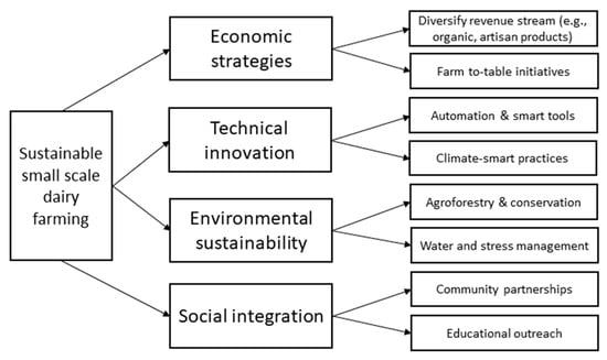 Diversifying into specialty items, such as organic milk or artisan cheese, can open new markets and create stable revenue streams [128]. By developing unique products and targeting niche markets, small farms can stand out in a crowded marketplace. Collaborating with local chefs or food artisans can also lead to the creation of exclusive products that highlight regional flavors. Agritourism, such as farm tours and dairy tastings, offers supplemental income while fostering a stronger consumer–producer connection [129]. This strategy not only generates additional revenue but also promotes awareness and appreciation for local dairy farming practices, building consumer loyalty and support.