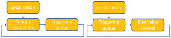 The so-called SACS (Spraying Application Control System) used in the plum orchard test was upgraded and prepared as part of the Interreg Central Europe project Transfarm 4.0 in pilot action 2—remote and proximal sensing [23]. Its operation is quite straightforward and summarized by the two flowcharts in Figure 1. The SACS utilizes advanced sensor systems which enable the precise application of PPPs. Τhe SACS aims to improve efficiency and automate spraying to make it more effective and responsible in terms of sustainable agricultural practices. The latter can be achieved by a system that detects the presence or absence of plant canopies in orchards or vineyards and enables an appropriate response according to the crop coverage. The principle is to spray where necessary and to stop spraying where there is no plant surface to be sprayed. The SACS uses multiple electromechanical components to carry out its tasks, including two TIM510 LiDAR sensors, 10 electro-magnetic valves (Tecomec, Reggio nell’Emilia RE, Italy), 16 relays (Controllino MEGA, Innsbruck, Austria) and a Raspberry PI 4 processing unit (Cambridge, England).