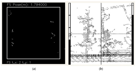 (a) Visualization of the processing part, FieldSLAM processing picture; (b) reconstruction of canopy tree trunks and actuators (nozzles) on the sides (rectangles on the edges—5 left, 5 right), where white = nozzle off, black = nozzle on.