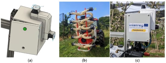(a) Render of the Spraying Application Control System (SACS), (b,c) actual implementation on the state-of-the-art mist blower, with numbers corresponding to each nozzle.