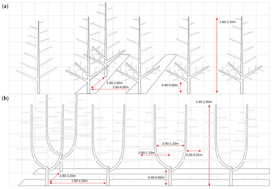 - Mika, A.; Buler, Z.; Chlebowska, D. The Effect of Training Systems and Planting Density on Growth and Fruiting of Plum Trees Grafted on Two Rootstocks. Acta Hortic. 1998, 478, 107–112. Available online: https://www.actahort.org/books/478/478_16.htm (accessed on 12 September 2023). [CrossRef]