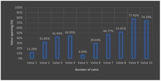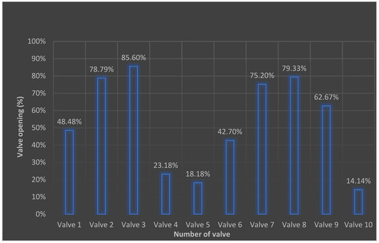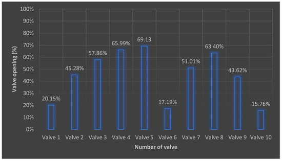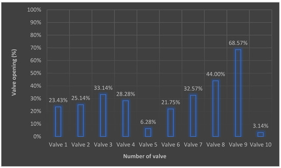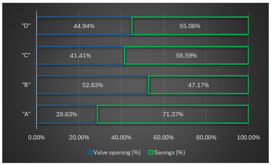 The graph in Figure 9 presents the average valve opening and the corresponding savings for each individual treatment, with the highest savings observed in Treatment “A” and the lowest in Treatment “B”. The graph below presents the average valve opening and the corresponding savings for each individual treatment.