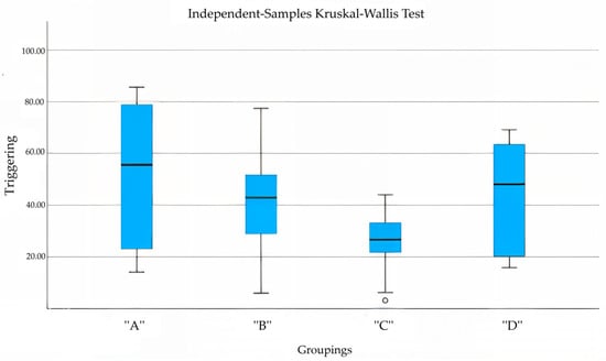 In addition to descriptive statistics for the interpretation of the results of the valve opening and closing in an individual training system, other statistical methods were also used in this study. The data were first entered and managed in Microsoft Excel (version 2301) and then transferred to IBM SPSS (version 29.0) for analysis. To assess the differences between the groups, we used the non-parametric Kruskal–Wallis test. In addition, we employed boxplots to visually display the distribution of the data for each group. The Kruskal–Wallis test was chosen because it does not assume a normal distribution of the data, making it appropriate for our non-normally distributed data. This test allowed us to determine if there were statistically significant differences between the groups. The boxplots were used to provide a clear visualization of the distribution of the data in each group, allowing us to identify any outliers or skewness in the data.