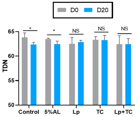 Total digestible nutrients (TDN) of corn stalk silages treated with additives after 60 days. AL, corn stalk co-ensiling with alfalfa hay; Lp, corn stalk with the addition of lactic acid bacteria (LAB); TC, corn stalk with the addition of cellulase; Lp+TC, corn stalk with the addition of LAB and cellulase; SEM, standard error of the mean. D0 and D20 indicated corn stalks at 0 and 20 days after ear harvest, respectively; bars labeled with * are significantly different (p < 0.05); NS means no significant.