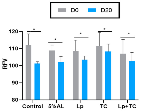 Relative feed value (RFV) of corn stalk silages treated with additives after 60 days. AL, corn stalk co-ensiling with alfalfa hay; Lp, corn stalk with the addition of lactic acid bacteria (LAB); TC, corn stalk with the addition of cellulase; Lp+TC, corn stalk with the addition of LAB and cellulase; SEM, standard error of the mean. D0 and D20 indicated corn stalks at 0 and 20 days after ear harvest, respectively; bars labeled with * are significantly different (p < 0.05).