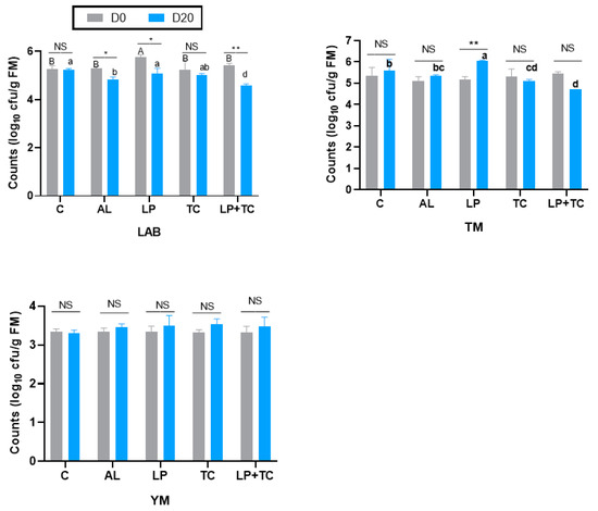 Microbial composition of corn stalk silages treated with additives after 60 days. AL, corn stalk co-ensiling with alfalfa hay; Lp, corn stalk with the addition of lactic acid bacteria (LAB); TC, corn stalk with the addition of cellulase; Lp+TC, corn stalk with the addition of LAB and cellulase; TM, total microorganisms; YM, yeasts and molds; C = control; AL = alfalfa; LP = Lactobacillus plantarum; TC = Trichoderma cellulase; LP+TC = L. plantarum + T. cellulase; and SEM, standard error of the mean. D0 and D20 indicate corn stalks at 0 and 20 days after ear harvest; bars labeled with * are significantly different (p < 0.05); bars labeled with ** are significantly different (p < 0.001); NS means no significant; and different superscripts in different letters indicate that additives differ (p < 0.05).