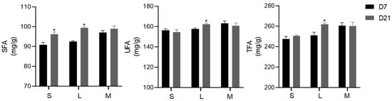 Changes in the nutritional composition of the egg yolk at 7 and 21 days. S: 1.5% soybean oil added to the base diet; L: 1.5% lard added to the base diet; and M: 1.5% mixed oils added to the base diet. SFAs: saturated fatty acids; UFA: saturated fatty acids; and TFA: total fatty acids. The fatty acids measured in this project include C14:0, C14:1, C15:0, C16:0, C16:1, C17:0, C18:0, C18:1n9c, C18:2n6c, C18:3n6, C18:3n3, C20:1, C20:2, C22:0, C20:3n6, C20:4n6, and C24:1. Values are the mean ± SEM. The significance level * p < 0.05 was used as the criterion for tendency.