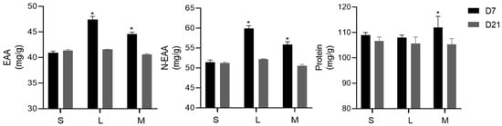 Changes in the nutritional composition of the albumen at 7 and 21 days. S: 1.5% soybean oil added to the base diet; L: 1.5% lard added to the base diet; and M: 1.5% mixed oils added to the base diet. EAA: essential amino acid; N-EAA: nonessential amino acid. The amino acids measured in this project include Asp, Thr, Ser, Glu, Gly, Ala, Cys, Val, Met, Ile, Leu, Tyr, Phe, Lys, His, Val, Arg, and Pro. Values are the mean ± SEM. The significance level was * p < 0.05 was used as the criterion for tendency.