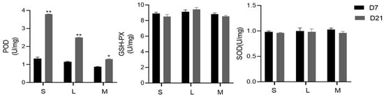 Changes in the antioxidant capacity of egg yolk at 7 and 21 days. S: 1.5% soybean oil added to the base diet; L: 1.5% lard added to the base diet; M: 1.5% mixed oils added to the base diet. POD: peroxidase; SOD: superoxide dismutase; GSH-PX: glutathione peroxidase. Values are mean ± SEM and significance levels of * p < 0.05, ** p < 0.01 were used as the criterion for tendency.
