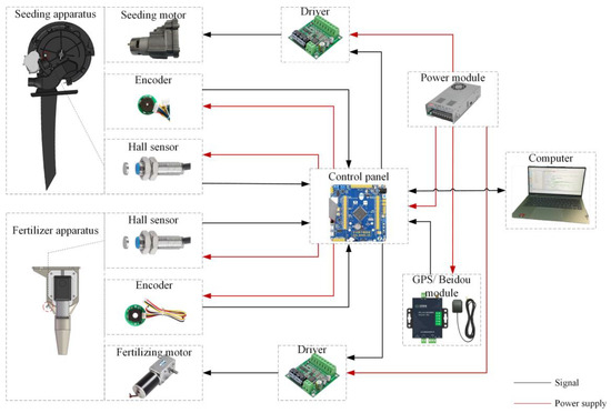 The control system hardware architecture integrates multiple essential circuits; notably, it features an STM32 microcontroller core to manage operations, an encoder interface for position feedback, a serial port debugging setup for diagnostics, a hall effect speed sensing mechanism, a dedicated power supply circuit, and a satellite GPS speed measurement receiver, along with any other ancillary components. The HS6602-485 GPS/Beidou dual-mode positioning module (Shandong Huxin Intelligent Technology Co., Ltd., Jinan, China) was selected to obtain the machine’s working speed. The working voltage is 5 V, the detection accuracy is 0.1 m·s−1, the update frequency is 1~10 Hz, and the communication protocol is Modbus. The positioning information is transmitted to the microcomputer through the RS485 standard communication port with a baud rate capability of 115,200 bps. Regarding sensor installation, magnetic beads have been meticulously placed just under each seed hole in the seed plate. Along the rotation path of the outer groove wheel, matching magnetic beads are embedded at corresponding positions within the grooves. Additionally, hall sensors are affixed to the casing of both the seed metering apparatus and the fertilization box housing to facilitate precise tracking. The STM8-P12 and 545-P16 AB phase hall encoders (Bengbu Juhua Network Technology Co., Ltd., Benbu, China) are used to detect the speed of the fertilizer and seeding motors, respectively. To ensure precise monitoring of the motor’s rotation, the encoder plate was professionally welded onto the motor’s tail-end electrode and solidly anchored. The magnetic ring component is attached to the motor’s tail shaft and revolves in tandem with it. A hall effect sensor is integrated within the system which adeptly transforms the mechanical angular velocity of the motor’s rotation into a digital signal composed of alternating high and low levels. These signals are then conveyed to the microcontroller by way of the A/B phase channels. This particular module runs on a power supply voltage of 3 V. For voltage regulation, we deploy an SD-350C-12 power module (Taizhou Mingwei Automation Co., Ltd., Wenzhou, China), which efficiently reduces 48 V to a steady 12 V, catering to the power needs of the entire setup. We selected the NJK-5001A (CHE8-10PA-H710)-type hall sensor (Zhejiang Huchuang Electric Co., Ltd., Wenzhou, China), with a sensor rated current of 300 mA, rated operating voltage of 5~30 V, effective detection distance of 10 mm, rapid induction, accurate detection, output mode PNP-NO, response time below 2 ms, and thread diameter model M 8. The hardware components of the control system are illustrated in Figure 1.