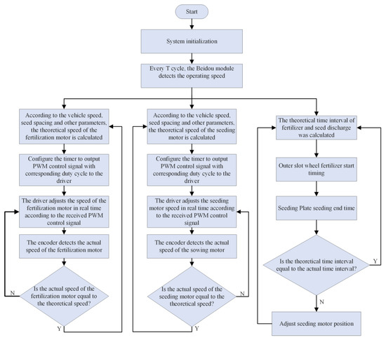 After the system is started, the parameters such as seed spacing, working speed, and number of seed holes are set. The seed metering device of the fertilizer discharger enters the working state. The system obtains the real-time speed value detected by the satellite speed measurement module. The STM32 microcontroller calculates the target speed of the fertilizer discharge motor based on the working speed, and outputs a PWM signal to drive the DC motor. The outer slot wheel fertilizer discharger is then driven after the reducer decelerates. The encoder collects the actual speed of the fertilizer motor, and the PID control algorithm adjusts the output PWM control signal in real time based on the deviation. This ensures that the speed of the fertilizer motor can quickly and accurately follow the operating speed, and the speed of the seeding motor can be controlled in the same manner. The overall scheme of the seed and fertilizer sowing control system is illustrated in Figure 5, based on the structure of the seed and fertilizer precision sowing control system.