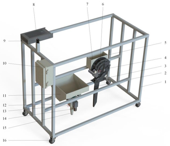 Structure diagram of seed fertilizer co-sowing device. 1. Aluminum profile machine. 2. Seed guide tube. 3. Aspirating pipe. 4. Seed metering device. 5. Seed box. 6. Seed sensor. 7. Seeding motor and its encoder and reducer. 8. Power supply. 9. Beidou/GPS antenna. 10. Distribution box. 11. Fluted roller fertilizer apparatus. 12. Fertilizer apparatus. 13. Fertilizer sensor. 14. Fertilizer motor and its encoder and reducer. 15. Fertilizer guide tube. 16. Wheels.