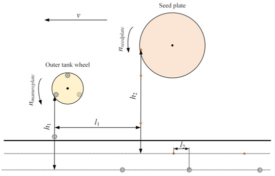 Taking the Dvor 2BQD-18 electric drive pneumatic precision seeder (Heilongjiang Dewo technology development Co., Ltd., Haerbin, China) [34] as an example, the operation process was to fertilize first and then seed. There was a certain installation distance between the fertilizer drop mouth and the seed guide mouth. To realize the correspondence between seed and fertilizer, it is necessary to determine the relative position of seed and fertilizer according to the time of seed and fertilizer drop. We assumed that the speed of the seeder did not change abruptly, and there was no bounce after the seed and fertilizer entered the soil.