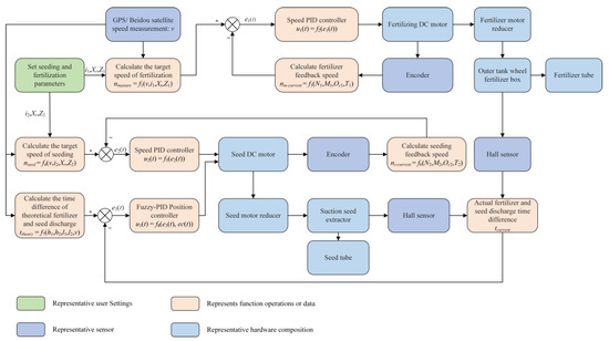 Sowing and fertilization are an important part of maize field production. The quality of these operations has an important impact on controlling the cost of agricultural materials, increasing crop yield, and improving planting income. Unreasonable fertilization methods will lead to a low fertilizer utilization rate, resulting in waste of fertilizer, thereby increasing agricultural production costs [1]. At present, production efficiency is mainly improved by maize seed and fertilizer co-sowing technology, which can not only save time and energy but also improve the utilization rate of fertilizer [2]. The fertilization method for maize seed and fertilizer-integrated machines mostly adopts strip fertilization [3,4]. The concentration of fertilizer is convenient for operation and easy to achieve for the purpose of deep application, but the application of fertilizer is easy to overdo [5,6]. Excessive use of chemical fertilizers can pollute the ecological environment, cause soil compaction, and burn seeds easily [7,8,9]. Hole fertilization is usually located on one side of the sowing position or the rear side of the sowing position. Fertilizer is applied into a reasonable position according to a certain number of holes. The recommended depth for seed fertilizer is 5 cm, the horizontal distance of seed fertilizer is 3~7 cm, the vertical distance of seed fertilizer is 3~5 cm, and the distance between fertilizer and seed should be more than 5 cm to prevent seed burning [4,10,11]. Hole fertilization is a more centralized method of fertilizer application than strip fertilization [12], and it can achieve the purpose of reducing fertilizer and increasing yield [13,14,15,16]. There are still shortcomings in the intelligent degree of sowing and fertilizing machines [17]. The seeding and fertilizing machines mainly rely on a ground wheel to drive the rotation of the seed plate and a groove wheel to realize the seeding and fertilizing operations. In the actual field operation environment, the ground wheel is easily affected by the ground conditions, resulting in problems such as jumping and slipping [18,19], which seriously affect the accuracy of sowing and fertilization. High precision is the development trend for the seeder. The improvement of mechanical properties alone cannot meet the requirements of high precision [20,21]. Using advanced motor control and measurement [22,23] and control technology based on seed and fertilizer sowing technology is a new way to solve the above problems, and it is also an inevitable requirement to improve the intelligence of seeders [20].