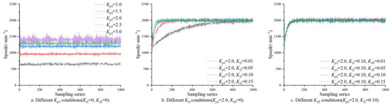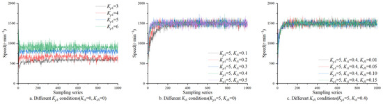 The step response curve of PID algorithm parameter tuning is shown in Figure 7 and Figure 8. Figure 7a shows that the steady-state error decreases with the increase in Kp. When the motor reaches a steady state, its speed value is always less than the target speed. A Kp that is too large will increase the overshoot and steady-state error of the system. When Kp1 = 5, the steady-state characteristics were better. The integral link was added to eliminate the steady-state error. Figure 7b shows that the integral effect increases with the increase in Ki1. When Kp1 = 5 and Ki1 = 0.4, the system response was faster, and the overshoot was minor. To further speed up the adjustment speed and increase the differential link, it can be seen from Figure 7c that Kd should not be too large under the target speed condition. When Kd1 = 0.1, the dynamic characteristics of the rising stage were better, and the overshoot was more minor. Similarly, when the PID parameters of the seeding motor were Kp2 = 2.0, Ki2 = 0.1, and Kd2 = 0.05, the system had better steady-state characteristics, faster response, minor overshoot, and better dynamic characteristics, which meets the requirements of precise simultaneous seeding of seed and fertilizer. The step response results are shown in Table 2.