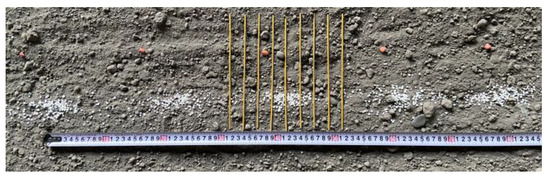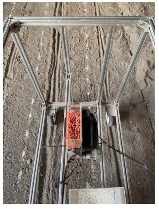 The test diagram of the device is shown in Figure 9 (the gas suction pipe has been pulled out). Figure 10 shows the fertilizer distribution when the operating speed was 3 km·h−1 and the seed spacing was set to 20 cm. As can be seen from Figure 10 and Figure 11, the fertilizer was basically clumpy, and the fertilizer increased first and then decreased in the direction of operation. The fertilizer in scattered places may be the fertilizer discharged by the outer tank wheel driving layer. At the same seed spacing, fertilizer distribution had no significant difference with the increased operation speed. The average fertilization amount deviation of hole fertilization was 6.7%, and the coefficient of variation range was 3.16~6.09%. The variation coefficient of fertilization stability ≤7.8% and the deviation of fertilization amount ≤15% in the industry technical specification document [40] are satisfied. After analyzing the actual operational situation, to enhance fertilizer concentration, potential modifications include reducing the number of grooves on the outer groove wheel, increasing the ratio of the fertilizer area above the outer groove wheel to the fertilizer storage area, enlarging the diameter of the outer groove wheel, and minimizing the fertilizer rolling time within the fertilizer box and guide tube after discharge. The fertilizer opening under the fertilizer guide tube can be designed to facilitate the fertilizer concentration.