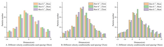A fertilizer mass distribution experiment and co-sowing accuracy experiment were conducted to investigate the impact of different seed spacing and working speeds on fertilization performance and co-sowing accuracy. The sampling time of the speed of the seeding motor and fertilizer motor was set to 20 ms, and the feedback period of the operation speed was set to 1.0 s. The negative pressure was set to 4.0 kPa, the horizontal distance between seeds and the center of fertilizer application in holes was set to 3 cm, and the fertilizer application amount in each hole was set to 5 g. At the same speed, the grain spacing was adjusted to 20, 25, and 30 cm successively, and the distribution of fertilizer on the ground was measured at 2 km·h−1, 3 km·h−1, and 4 km·h−1. In the direction of machine operation, the least dense area of fertilizer in the two holes was selected as the beginning and end of the single-hole fertilizer interval, and the fertilizer interval was successively divided into several sub-intervals at an interval of 2.5 cm. The number of fertilizer particles and the longitudinal distance between seeds and the fertilization center in each subinterval were measured in the stable operation area. The size of fertilizer particles was assumed to be evenly distributed in the fertilizer. The number of fertilizer particles in 10 holes conforming to the grain spacing standard was collected in each group. Five sections were randomly selected in each group, and 20 pairs of seed fertilizer longitudinal distances were recorded in each section. According to the industry technical specification document [40], the qualified index for hole fertilization was determined by measuring whether the distance between the seed and the fertilizer center fell within the range of 3 ± 2 cm.