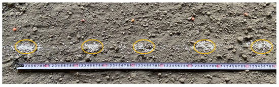 A test was conducted to evaluate the accuracy of co-sowing seeds and fertilizer at different seed spacing and operation speeds. The bench test and seed and fertilizer distribution are illustrated in Figure 12, and the precision test results are presented in Table 3. We have circled the fertilizer concentration area in Figure 12. The qualified index of hole fertilization decreased with an increase in operation speed while still meeting the required threshold of ≥80%. During operation, the fertilizer was mostly concentrated behind the seed, resulting in a good seed–fertilizer match and precise sowing of maize. To reduce the occurrence of seed bouncing during the test, the height of the seed discharging device can be appropriately reduced, and the length of the seed guide tube can be shortened. To better align the seed and fertilizer and determine the timing of seed and fertilizer discharge, we can first test them independently and then adjust the delay time t3 for optimal results. However, the simplified experimental design also has some limitations. Due to the difference in environment, mechanical structure, and vibration of the device, the qualified rate of sowing fertilizer in the field may be lower than that in the soil tank test. In future studies, we will consider devices that contain multiple seeding and fertilization monomers and conduct a more comprehensive and detailed evaluation of their performance. The adaptability of the control system in complex field conditions and the accuracy of the seed fertilizer co-sowing can be further examined.