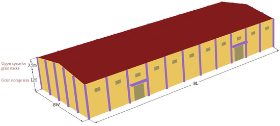 The grain warehouse is the most typical granary building, accounting for more than 85% of the total grain storage capacity in China [39]. In this study, 15 design parameters related to the energy use of grain warehouses (including three major categories of form parameters, envelope structure parameters, and equipment parameter) were summarized, with the specific parameter names and the ranges of variation shown in Table 1. The geometry model of the grain warehouse is constructed using Grasshopper based on the parameters obtained, as shown in Figure 2. In the range of orientation shown in Table 1, 0° means that the long side of the building is oriented north–south and rotated counterclockwise, and 90° indicates that the long side is rotated to face east–west. In the cooling set-point temperature, the low-temperature storage of the granary requires average grain pile temperatures below 15 °C, and the quasi-low-temperature storage requires a local temperature below 25 °C [40]. Therefore, the range of the temperature is [15 °C, 25 °C].