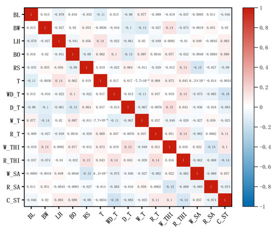 Pearson’s correlation coefficient can be used to analyze the correlation between multiple parameters [51,52]. The absolute value of the correlation coefficient determines the degree of correlation between two parameters, which is generally classified into four degrees: no correlation (0–0.1), low correlation (0.1–0.3), medium correlation (0.3–0.5), and significant correlation (0.5–1). As shown in Figure 3, the correlation coefficients for most of the 15 parameters influencing the energy use of the grain granary are less than 0.1, and few parameters have correlation coefficients greater between 0.1 and 0.18. Consequently, it is assumed that there is no linear correlation between these 15 parameters (i.e., the parameters are independent). SRC and Sobol sensitivity analysis methods can be used.