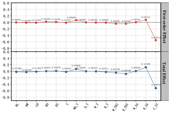 The 1024 sets of samples extracted by the Sobol method yielded 1024 sets of energy use data. In addition, the sensitivity analysis was conducted using the Sobol method with the first-order effect coefficients and the total effect coefficients as output indicators. The first-order effect coefficient refers to the significance of the parameter sensitivity, which has a direct effect on the output of energy use. A larger first-order effect coefficient suggests stronger sensitivity and a greater impact on the results. The total effect coefficient refers to the impact of the parameter interaction on energy use.
