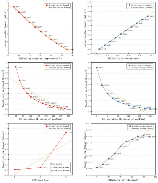 Each of the six main parameters was analyzed, and the optimal range was determined according to the changes in their inflection points or slopes. The results of the local sensitivity factor analysis are shown in Figure 7. The red or blue line in the figure represents the actual cooling energy demand, which is the actual simulated energy consumption value of the granary obtained by varying each influencing factor within its value range. The yellow line represents the average cooling energy demand, which is a smooth curve generated by averaging the actual energy demand values.
