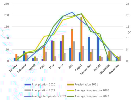 Total precipitation and average air temperature at the Experimental Station in Prusy, University of Agriculture in Kraków, between 2020 and 2022.