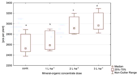 The highest number of generative shoots was developed by plants in the first year, while in the following years it was lower (Table 2, Figure 2). The applied treatment significantly affected the number of generative shoots. In the variant with the highest dose of the organic-mineral concentrate at 3 L·ha−1, the number of shoots was the highest. Similarly, in the second variant, with 2 L·ha−1, a statistically significant higher number of shoots was recorded than on the control plot. The number of shoots showed a variation of 9.0%.
