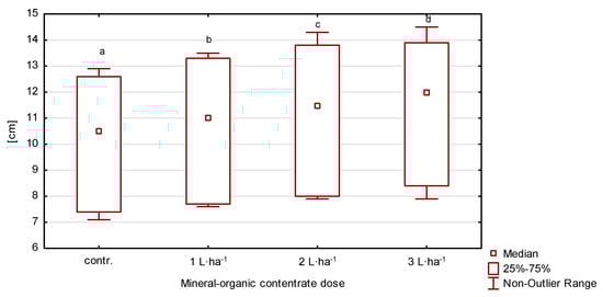 Depending on the year of the experiment and fertilizer treatment, the length of the flag leaf ranged from 7.26 to 14.24 cm (Table 2, Figure 3). The lowest values were recorded in plants from the control plot and in those fertilized with the organic-mineral concentrate at 1 L·ha−1. Plants from plots fertilized with higher doses had significantly higher (p ≤ 0.05) values in relation to plants from the control facility. Across the growing seasons, the year 2020 had the greatest variation (V = 23.1%) with low growing season rainfall of 385.2 mm.