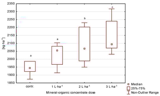 Seed yield of perennial ryegrass in response to the dose of organic-mineral concentrate, average of 2020–2022. The same letters (a, b, c) mean no statistically significant changes (p ≥ 0.05).