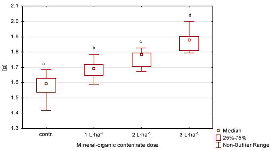 Thousand-seed weight of perennial ryegrass in response to the dose of organic-mineral concentrate; average of 2020–2022. The same letters (a, b, c, d) mean no statistically significant changes (p ≥ 0.05).