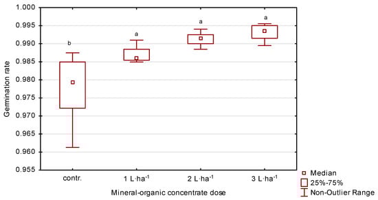 Germination capacity of perennial ryegrass in response to the dose of organic-mineral concentrate, average of 2020–2022. The same letters (a, b) mean no statistically significant changes (p ≥ 0.05).