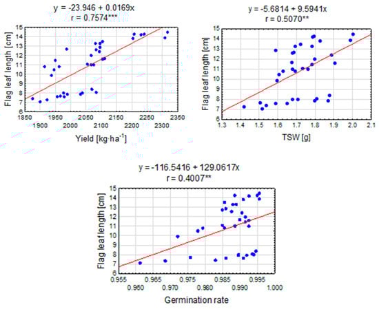 The linear relationship between the flag leaf length [cm] and the selected elements of the perennial ryegrass productive variables. The linear regression equation and the Pearson correlation coefficient (r) are shown when the r is significant (**, ***—at 0.01 and 0.001 probability level). The points represent means over 2020–2022.