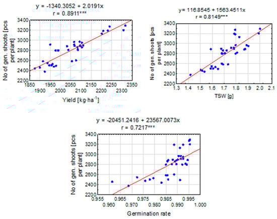 The linear relationship between the number of generative shoots [pcs per plant] and the selected elements of the perennial ryegrass productive variables. The linear regression equation and the Pearson correlation coefficient (r) are shown when the r is significant (***—at 0.001 probability level). The points represent means over 2020–2022.