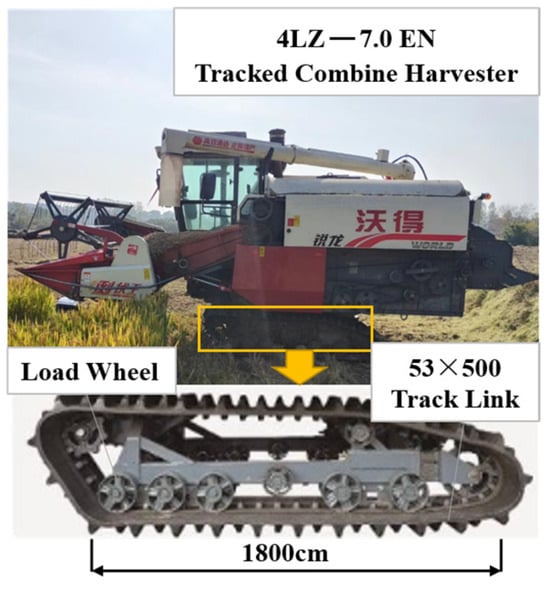 The combined harvester with a 6–10 kg feeding volume and is widely used in Asia because of its advantages of being lightweight, easy to carry, and low cost. The combined harvester used in the experiment is 4LZ-7.0EN (Made by World Group, Zhenjiang, China). The picture of the harvester is shown in Figure 2. The rubber track was used in the undercarriage system, which enables the harvester to adapt to the wet and soft paddy soil. Some structural parameters of 4LZ-7.0EN are shown in Table 3.