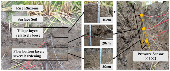 The combined harvester traveling test was designed to measure the compaction of paddy soil during the harvester walking process. Firstly, a soil pit with a length of 1 m and a depth of 35 cm was dug along the driving direction of the harvester in the field. Then, dig out horizontal slots at depths of 10 cm, 20 cm, and 30 cm from the ground to ensure that the pressure sensor can be completely horizontally placed inside the soil layer. The locations of the sensors are shown in Figure 4 and Figure 5. Two sensors are arranged horizontally at the same depth, and a total of 2 × 3 pressure sensors are arranged at three depths.