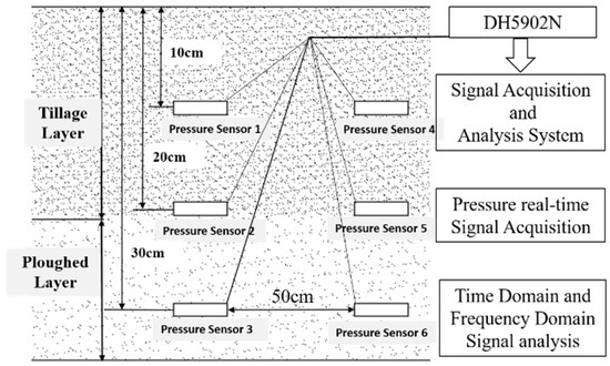 The vibration signal of the harvester will be transmitted not only to the surface soil but also to the interior of the paddy soil. The pressure signals of the soil at different depths were collected and analyzed to clarify the vibration compaction effect of the combined harvester vibration on the field soil.
