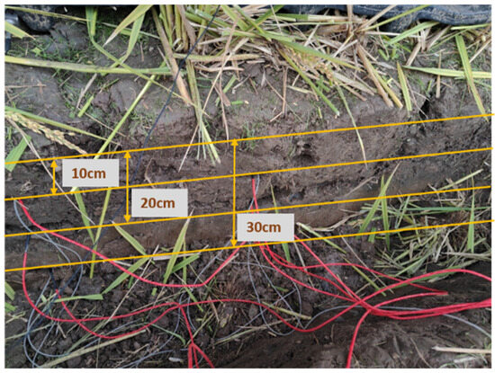 The color difference is mainly due to the action of microorganisms in the soil, rice roots, and chemical fertilizers. The difference in components directly caused different characteristics of the soil at a depth of 0–35 cm. Therefore, in order to ensure that the test measurement cover all depths of soil, the sensor was buried at a depth of 10 cm, 20 cm, and 30 cm, which is convenient for the linear analysis of the load, so as to analyze the soil bearing characteristics of three different physical properties in the soil layer.