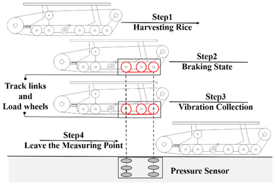 There is obvious self-excited vibration in the operation process of the tracked combine harvester, which vibrates and compacts the soil. Therefore, the influence of self-excited vibration on soil compaction was analyzed by measuring the vibration signal of the combined harvester and soil ballast. The test first buried the sensor on the harvesting path, and the burial method and sensor arrangement position are the same as those in Figure 4. Move the harvester forward at a normal harvesting speed and harvest the rice. When the harvester reaches above the sensor, stop moving forward. Place the three acceleration sensors in turn on the chassis frame of the combine harvester, the 12 o’clock position of the bearing wheel, and under the track. The test process and sensor placement are shown in Figure 6 and Figure 7.