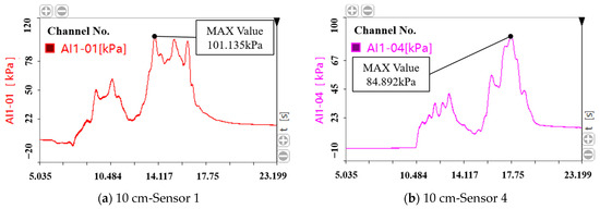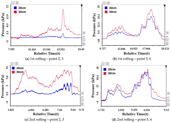 The average value of the soil peak pressure at a depth of 30 cm is 13.02 kPa at point 4 and 24.67 kPa at point 6, which is not significantly different from the soil pressure at a depth of 20 cm. In order to further distinguish the pressure values of the soil at these two depths, the pressure time domain curves obtained from the test were compared. Since the test data at the same speed are relatively similar, it is only necessary to analyze the data of the first two rollings. The resulting curve is shown in Figure 11.