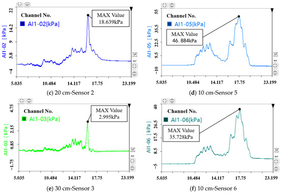 The pressure sensor was used to test and collect the loading conditions of the soil at depths of 10 cm, 20 cm, and 30 cm. The test considered the three factors of rolling speed, rolling times, and rolling depth and collected a total of 72 sets of test data under different conditions. First, the crawler combines advances at a low speed (0.27 m/s), and the pressure signals of six measuring points are obtained, as shown in Figure 8.