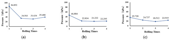 Via the analysis of the four peak pressures, it was found that the plastic deformation of the soil under the first rolling was the most obvious at the depths of 10 cm and 20 cm. The pressure values of the three depth measuring points have a downward trend from the second to the third time, but the trend is small. The load increased again from the third to the fourth time, but the difference was small. It is believed that the subsequent three rollings were dominated by elastic deformation.