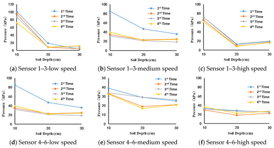 Each set of line charts contains the values of the four rollings. After the track-type combine has rolled over the soil, the soil pressure decreases with depth. At the same measuring point at the same travel speed, the numerical coincidence of the four times of rolling is relatively high. In addition, the pressure peak at the depth of 10 cm in the soil is generally larger than that at the depth of 20 cm–30 cm. In the case of high-speed rolling at measuring points 1–3, the pressure value of the 30 cm depth is slightly higher than the pressure value of 20 cm in the four times of crawler rolling.