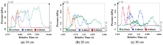 The pressure value on the paddy soil is the convolution result of the dynamic load applied by the harvester. The pressure value is related not only to the mass distribution in the forward direction of the harvester but also to the loading time. In order to weaken the difference of soil elastic-plastic deformation caused by the rolling sequence, the third rolling data under the condition of three driving speeds was selected for analysis, and the pressure time domain signal of the effective section was intercepted, and the obtained curves are shown in Figure 13.